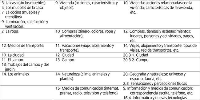 Así, aunque en los trabajos de algunos investigadores se han incluido otros temas o centros de interés[16] que no son los utilizados tradicionalmente, nosotros hemos querido tomar como base los aparecidos en el Marco Común Europeo de Referencia de las Lenguas, y renovados por el Plan Curricular del Instituto Cervantes (PCIC) (IC, 2006) puesto el inventario de entradas recogido tiene el "objetivo de dar una idea del tipo de unidades léxicas que el hablante debe conocer en cada uno de los niveles" (IC, 2006) y es aquí donde hasta ahora mejor aparecen desarrollados los niveles de referencia para el español según las recomendaciones propuestas en el MCERL. Al mismo tiempo, nuestro objetivo en trabajos futuros será comparar la DL de nuestros estudiantes con la propuesta hecha por el IC (2006). Veamos, en primer lugar, cuáles son los temas o nociones específicas empleadas en el PCIC:
