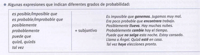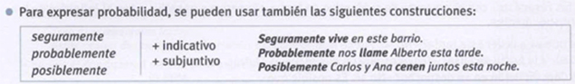 Como se puede apreciar en las figuras 1 y 2, las informaciones proporcionadas, es decir, el elenco de las expresiones (recursos léxicos de la modalidad epistémica) y la indicación de los posibles modos verbales (recursos formales del sistema gramatical) no arroja ninguna luz sobre la expresión de la probabilidad en español ni sobre la gradación de la misma. De hecho, para los estudiantes cuya lengua materna se vale de otros recursos (entre otros los léxicos, como en el caso del polaco) para expresar la posibilidad, los cuadros de arriba carecen de valor informativo. ¿El grado de probabilidad depende del elemento léxico o es intrínseco al modo verbal o, más bien, es el resultado de la utilización de ambos recursos? En ningún lugar el estudiante encuentra la respuesta a esta pregunta. Además, del cuadro presentado en la Ilustración 2 es imposible deducir si los tres vocablos presentados se utilizan solo en indicativo o en subjuntivo. ¿Cuál de ellas va con el subjuntivo? ¿Seguramente se utiliza solo con el indicativo? Tampoco se reflexiona sobre el mecanismo de la expresión de la probabilidad, a la que se vuelve a la hora de introducir nuevas estructuras. El modo subjuntivo de las lenguas romances resulta en sí muy difícil de entender a quienes no lo tienen en el sistema de la lengua materna. Una de las dificultades principales es, entre otras, su peculiar función de regular la posibilidad y la probabilidad. De ahí que sea un elemento importante a la hora de expresar la modalidad epistémica. Por lo tanto, estamos convencidos de que en los manuales de E/LE ha de presentarse un análisis más profundo centrado en esta función del modo verbal.