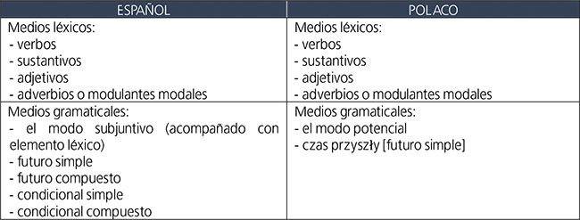 Las dos lenguas que nos interesan para los fines de este estudio, es decir, el polaco y el español, se valen de diferentes recursos para expresar la modalidad epistémica. Estos abarcan desde las categorías morfológicas, léxicas y sintácticas hasta las prosódicas; además, todas ellas pueden funcionar conjuntamente, sin excluirse entre sí (Pihler Ciglič, 2014: 382).