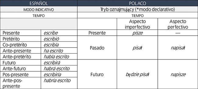Dichas informaciones le permitieron al autor construir una tabla de los sistemas temporales de ambos idiomas, que presenta, de forma comparada, los tiempos verbales del indicativo de los idiomas español y polaco.