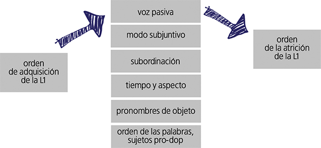 En líneas generales, se observa una retención inestable de la morfología del español manifestada tanto en transferencias del hebreo como en desvíos de la norma rioplatense. Tal como sostiene Montrul, “está claro que la lengua no se pierde totalmente, sino que muestra cambios gramaticales localizados” (2013: 212). En este mismo trabajo, la autora aplica la hipótesis de la regresión de R. Jakobson (1941) que “postula que la pérdida de una lengua es una imagen espejo de la adquisición: las estructuras adquiridas más tarde en el desarrollo de la lengua son las primeras que se pierden en el proceso de atrición” (Montrul, 2013: 212). Al aplicar esta hipótesis al español, la autora obtiene la siguiente figura: