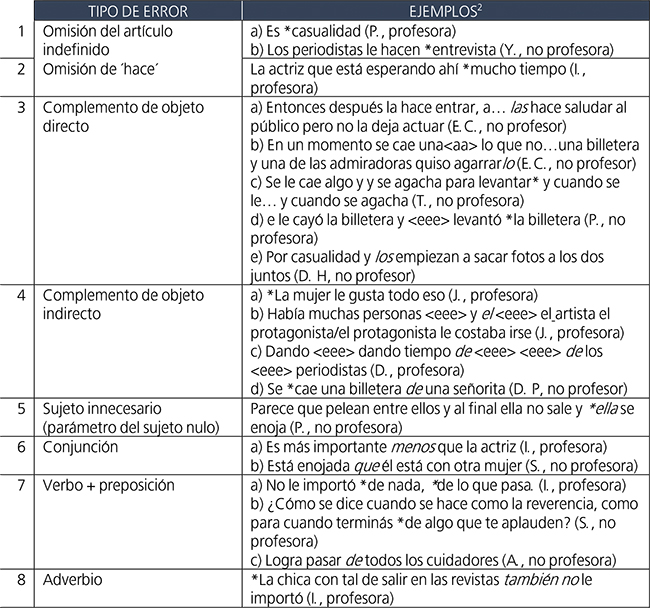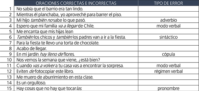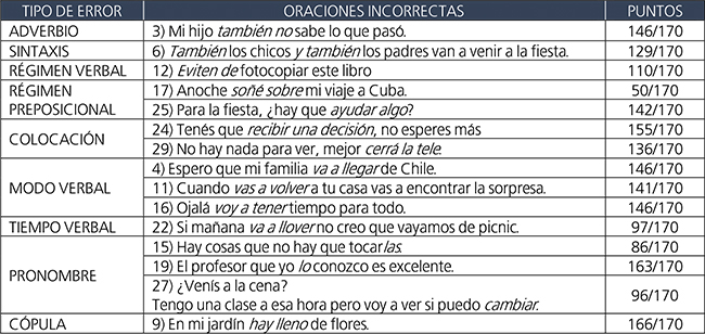 Tal como puede observarse en la Tabla 3, las dos oraciones incorrectas menos detectadas o cuyos errores no fueron corregidos contenían un error de régimen preposicional (oración 17: *soñar sobre) o en el pronombre de objeto directo (oración 15: *Hay cosas que no hay que tocarlas). Por el contrario, el error más detectado fue el de la oración que contenía un error en la cópula (oración 9: *hay lleno).