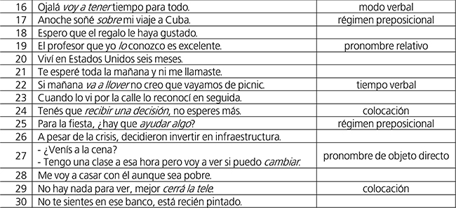 Con respecto al puntaje, si el participante detectaba el error y lo corregía se le daban dos puntos, si detectaba el error pero no era capaz de corregirlo o la corrección era equivocada se le daba un punto, si juzgaba que una oración errónea era correcta no se le daba ningún punto, y si corregía una oración correcta, se le restaba un punto. El puntaje máximo total podía ser de 30 puntos (15 oraciones incorrectas x 2). A continuación se presenta la lista de los 30 enunciados para la prueba de gramaticalidad: