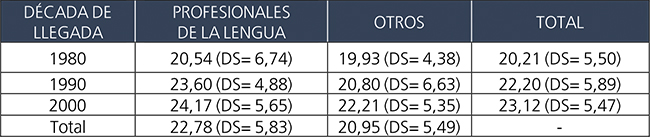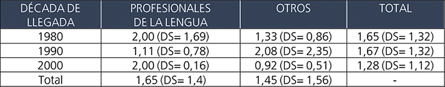 Tal como lo muestra la Tabla 4, sorprendentemente, los profesionales de la lengua cometieron, en promedio, más desvíos (1,65 DS= 1,4) que los no profesionales de la lengua (1,45, DS= 1,56). Por su parte, los migrantes más recientes cometieron menos desvíos (1,28, DS= 1,12) que sus compatriotas que llegaron en décadas anteriores. Sin embargo, estas diferencias no resultaron estadísticamente significativas