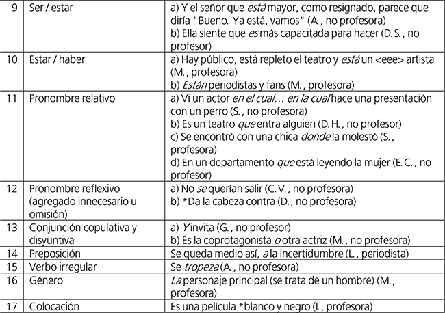 Más allá de los resultados cuantitativos, creíamos que se obtendría una información más ilustrativa al indagar en los tipos de desvíos cometidos. Al analizar cualitativamente nuestro corpus, se detectaron desvíos de la norma rioplatense, que fueron clasificados en 17 categorías (ver Tabla 5).