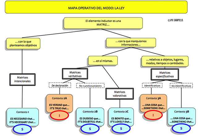 En la Figura 1, más abajo, se puede ver el mapa operativo del modo desarrollado por Ruiz Campillo (2007a), el cual ofrece al aprendiente la posibilidad de tener a su disposición una herramienta con la cual, a partir de un solo valor operativo (declaración y no declaración), ir desarrollando su propia clasificación de las diferentes matrices propias del contraste modal español. Este mapa incluye seis contextos en total, de los cuales dos son declarativos y cuatro no declarativos. Cada vez que aparece una matriz nueva en el input, el aprendiente puede clasificarla él mismo en uno de esos seis contextos simplemente utilizando la pareja conceptual de la declaración y no declaración como mecanismo.