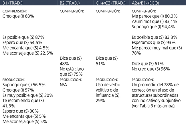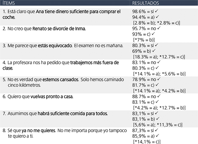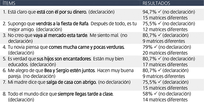 Por ejemplo, en el ítem 1, la gran mayoría (94,7%) produjo una frase adecuada, es decir, una matriz no declarativa y la forma correcta del presente de subjuntivo del verbo subordinado (esté). Solo el 38,6% utilizó la matriz en forma negativa, es decir, no está claro que, el resto (61,4%) usó un total de 14 matrices diferentes, lo que demuestra que estos estudiantes conocían bien el significado de esas matrices y que podían clasificarlas como no declarativas.