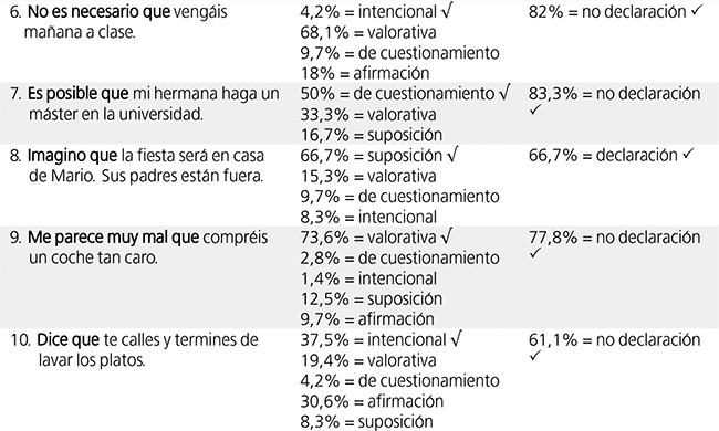 El ítem 6 contenía una matriz intencional en forma negativa. Las matrices intencionales indican deseos u objetivos por parte del hablante o sujeto, por lo que en forma negativa indican lo contrario, un deseo u objetivo que no se quiere o no se necesita realizar. Es muy probable que el hecho de que estuviera en forma negativa confundiera a la mayoría de los participantes y decidieran que se trataba de una valorativa, contexto más elegido por los mismos en cuanto surgían dudas a la hora de clasificar los ítems no declarativos, como se ha mencionado previamente. Por otra parte, las profesoras participantes también lo relacionaron con una valorativa en un principio. Esto se puede deber a que, dentro del enfoque tradicional, estas matrices se han identificado en muchos casos con valoraciones (Llopis-García, Real Espinosa y Ruiz Campillo, 2012: 91-92). Sin embargo, es importante señalar, que, incluso en este caso, una gran parte de los participantes (82%) reconocieron esta matriz como no declarativa de manera adecuada.