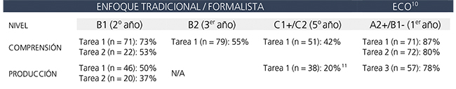 Formando parte de la misma investigación de doctorado, se llevó a cabo otro estudio empírico previo con estudiantes universitarios[9] británicos en todos los niveles de competencia a los que se les había introducido el contraste modal mediante un enfoque tradicional o formalista. En este caso, los estudiantes participantes también completaron una serie de tareas de comprensión y producción, las cuales se analizaron siguiendo una metodología similar a las del presente estudio. En la Tabla 4 a continuación se comparan los resultados entre los dos estudios empíricos mediante los promedios de respuestas adecuadas en las tareas de comprensión y producción completadas por los distintos conjuntos de participantes.