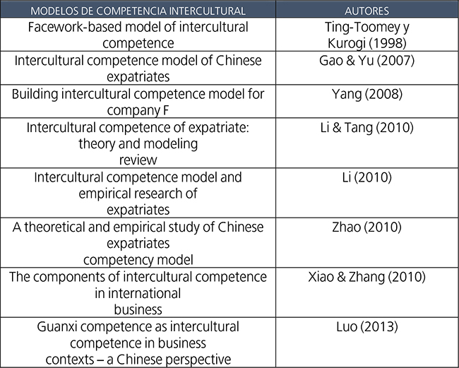 Ya en el presente siglo, las investigaciones sobre la competencia intercultural han tenido cada vez más seguidores. En un primer momento, se centraron en el campo de los expatriados sinohablantes residentes en el extranjero, para abordar a continuación el área de los negocios internacionales. Con todo, la mayoría de estos trabajos está escritos en lengua china, razón por la que han tenido un menor impacto a nivel internacional. En la siguiente tabla, recogemos la síntesis que realiza Chong (2015), sobre estos modelos.