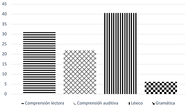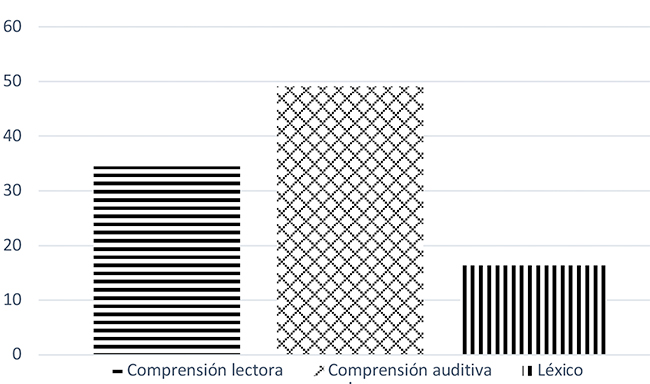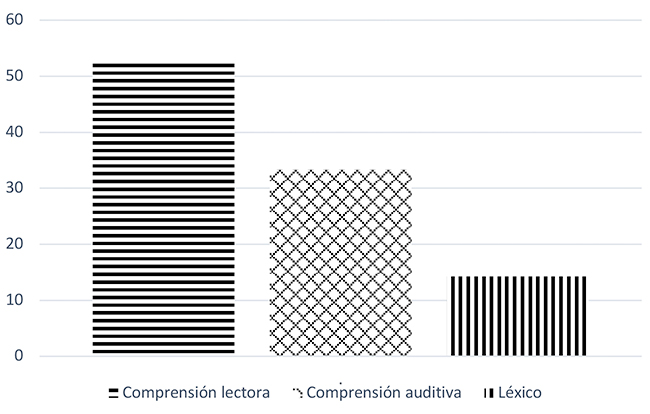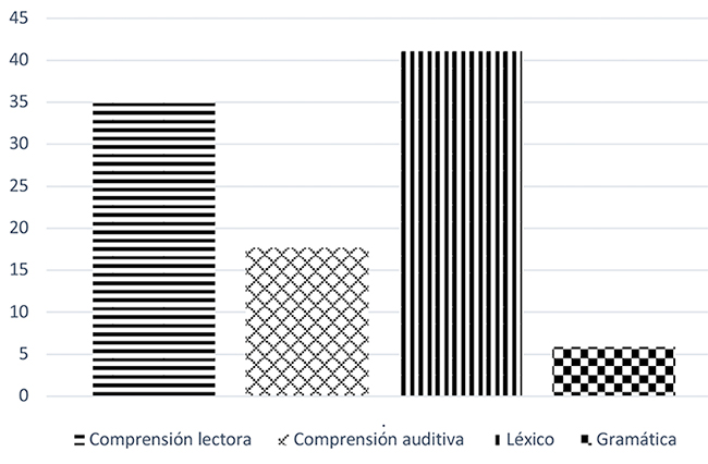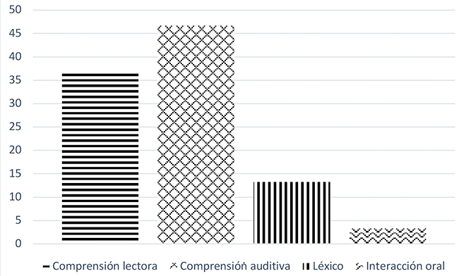 No obstante, en menos de la mitad de los manuales es la comprensión lectora la destreza que más actividades tiene (Aula Internacional 3, 11 actividades, 52% de las que aparecen en libro; Bitácora 4, 5 actividades, 18,5%; y ELE Actual 3, 19 actividades, 48,7%), mientras que en otros tres manuales es la comprensión auditiva (Gente Hoy 2, 14 actividades, 44%; Nuevo Prisma B1, 26 actividades, 49%; Bitácora 3, 9 actividades, 33%). Por último, en solo dos manuales es el léxico el que más actividades tiene en las que aparecen las expresiones metafóricas (Campus Sur, 7 actividades, 41,2%; y Vente 2, 13 actividades, 40,6%).