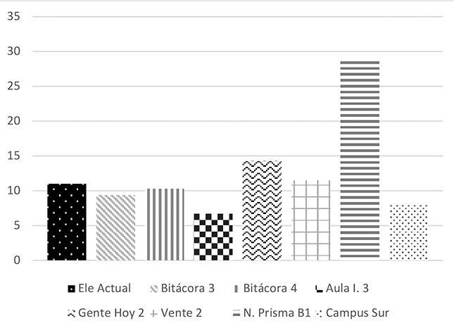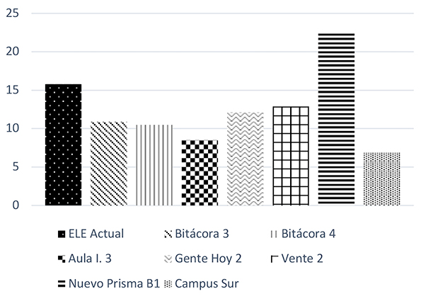 Tras preguntar a diversas universidades y academias, seleccionamos ocho manuales: ELE Actual 3 (2007), Bitácora 3 (2013), Bitácora 4 (2014), Aula Internacional 3[1](2014), Gente Hoy (2014), Vente 2 (2014), Nuevo Prisma B1 (2016),Campus Sur (2017). Los ocho manuales seleccionados para este análisis recogen los contenidos por niveles que propone el PCIC (2006) y los niveles y las orientaciones que se contemplan en el MCER (2002).