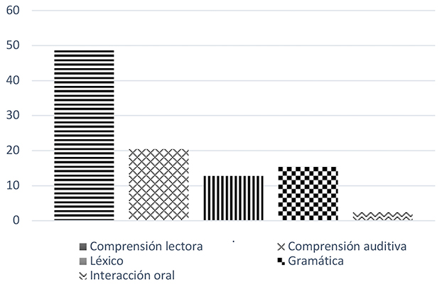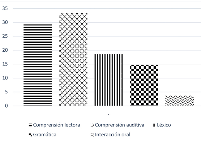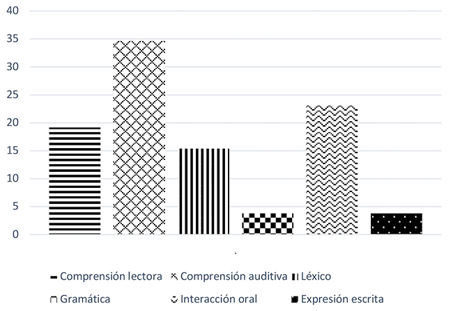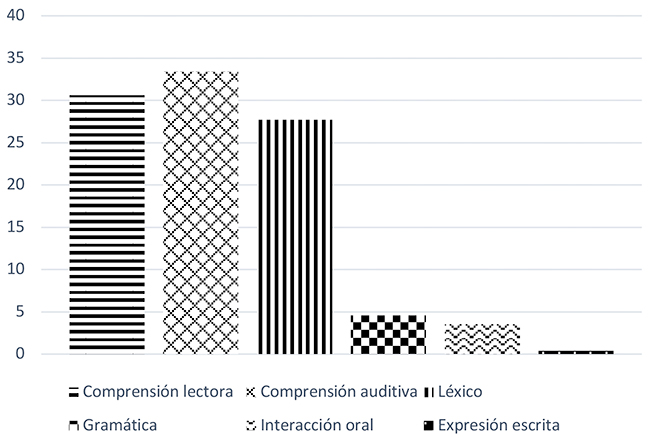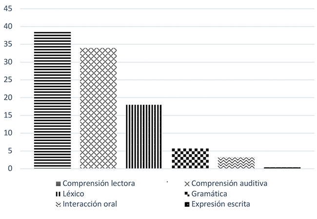 Con respecto a las destrezas, la gramática y el vocabulario, sorprende que la destreza de lectura prevalezca en las actividades de los manuales analizados (38,5% de las actividades), seguida de la comprensión auditiva (34%), y también llama la atención que las actividades de léxico se sitúen en tercer lugar (18,2%), a una distancia bastante considerable. La cuarta posición la ocupa la gramática (5,7%), seguida de la interacción oral (3,2%). La expresión escrita es la que menos actividades tiene (1 actividad, 0,4%).