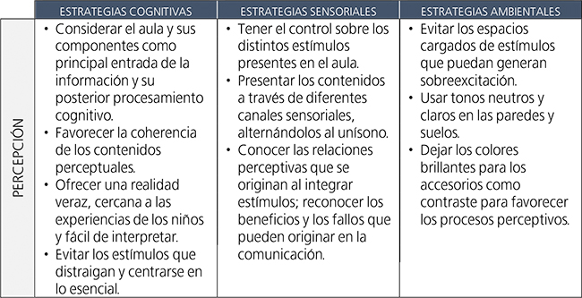 El esquema que presentamos a continuación muestra las conexiones entre los tres tipos de estrategias y procesos cognitivos básicos (percepción, atención y memoria) y complejos (lenguaje). Aclaramos que, en estos últimos, dadas las limitaciones de extensión del presente trabajo, incidimos solo en el lenguaje, por su relevancia en la ASL. De esta forma, se aportan estrategias cognitivas, sensoriales y ambientales para cada uno de los procesos cognitivos señalados.