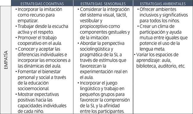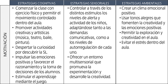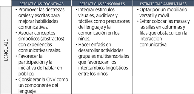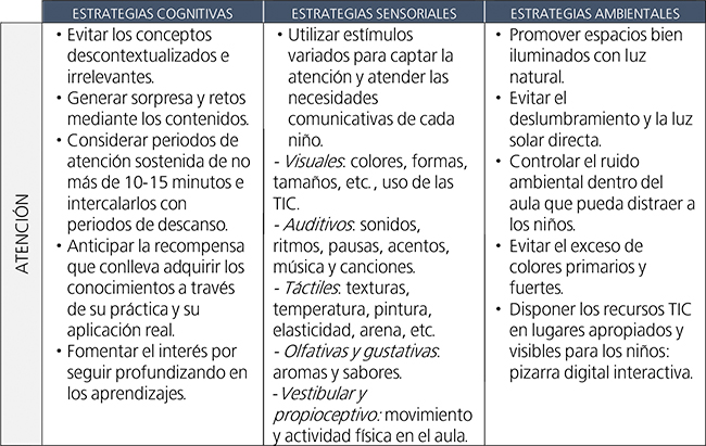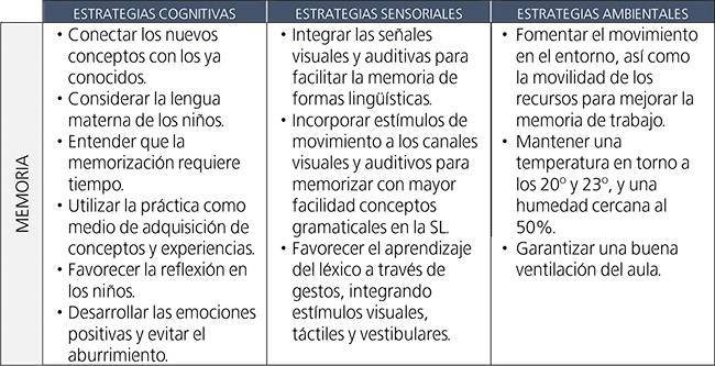 En este apartado presentamos, a modo de propuesta, un repertorio de estrategias cognitivas, sensoriales y ambientales que recogen los fundamentos de los procesos mentales que intervienen en la ASL, tratados en los apartados anteriores y, en su conjunto, pretenden favorecer los procesos cognitivos. Estas tres estrategias pueden definirse de la siguiente forma: