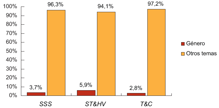 Los artículos sobre género publicados en las revistas fueron N=117, es decir casi el 4% de los artículos publicados en las tres revistas. Los artículos fueron realizados por las contribuciones de 105 mujeres y 51 hombres. Los artículos sobre género fueron realizados mayoritariamente de forma individual (72,5%), con la autoría de 65 mujeres y 20 hombres. ST&HV y T&C cuentan con sendos números especiales dedicados al género, publicados en 1995 y 1997 respectivamente.[2]