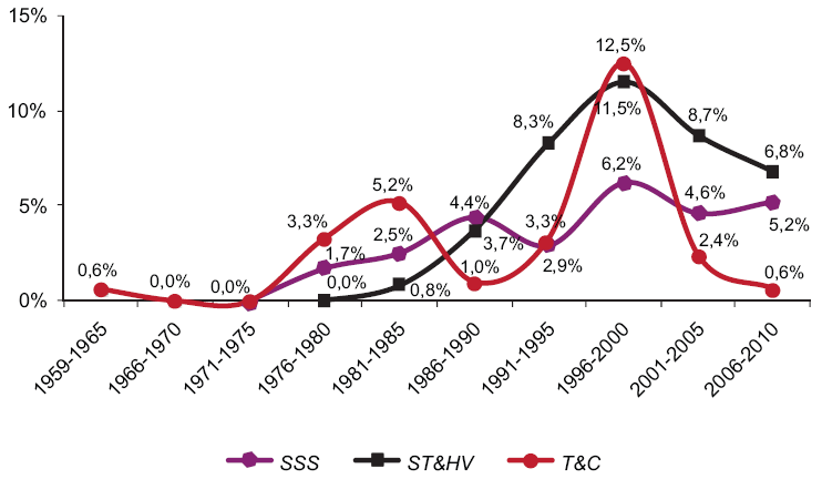 Se observa que la primera revista con publicaciones de género fue T&C, por el año más temprano de su fundación, después SSS y más tarde ST&HV (Gráfica 5). T&C presenta incrementos importantes durante la década de los años 70 y al principio de los años 80, descendiendo en el periodo 1986-1990 para encontrarse con el mismo porcentaje que al inicio de la revista (1959-1965). La mayor concentración de artículos sobre género fueron realizados entre 1996 y 2000, debido a la publicación del número especial sobre género en 1997. SSS experimenta un incremento constante que alcanza 19,4% (del total de artículos de género identificados) en el periodo de 1986-1990, descendiendo en el siguiente periodo, pero sigue siendo la década de los 90 (1996-2000) en que se encuentra la mayor proporción de artículos sobre género (29%). En el caso de ST&HV, los artículos sobre género se incrementaron constantemente hasta alcanzar el porcentaje más alto en el periodo 1996-2000 (31,4%), aunque este incremente no coincide, como en T&C, con el número especial sobre feminismo. Se puede apreciar que en los primeros años del 2000 hubo una disminución en el porcentaje de trabajos sobre género en las tres revistas. Si comparamos estos datos con los encontrados en 2006-2010, vemos menos trabajos con perspectiva feminista, quizás la consolidación y reconocimiento de la teoría feminista provoca que no se considere el género como objeto de estudio principal o como único marco teórico, privilegiando más bien el aspecto transversal y de intersección.
