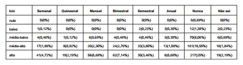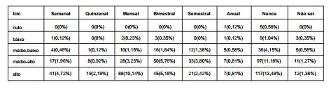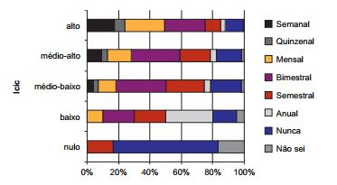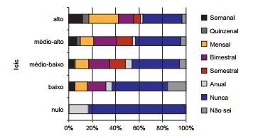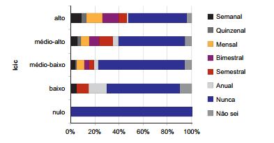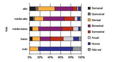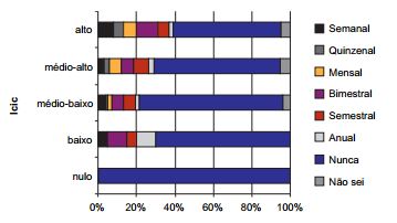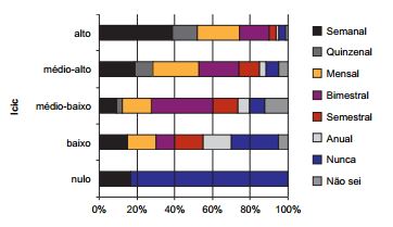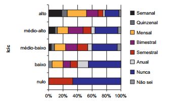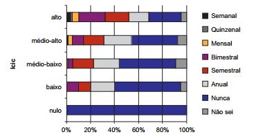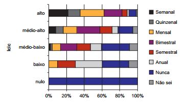 Mais uma vez, se analisados os grupos de Icic separadamente, observa-se que as faixas de maior frequência (“semanal”, “quinzenal” e “mensal”) aumentam conforme cresce o Icic; e as faixas de menor frequência (“nunca” e “anual”) diminuem (Gráfico 8).