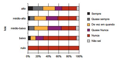 Neste caso, observa-se uma maior frequência para a realização da prática pedagógica para todos os grupos de Icic, em relação às demais práticas tratadas até agora. A categoria de Icic “nulo” ainda apresenta índices elevados de professores que nunca realizam trabalhos interdisciplinares (cerca de 70% do grupo), mas a taxa cai consideravelmente para as demais categorias.