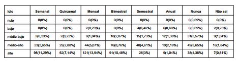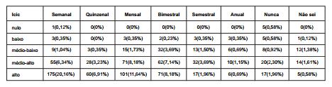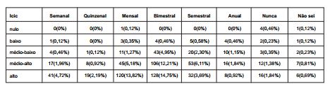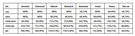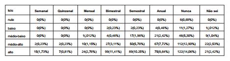 Aqui também é possível notar uma relação entre as frequências de realização da prática pedagógica por parte dos professores e o nível de Icic dos mesmos: aumentam as porcentagens de frequências “semanal”, “quinzenal”, “mensal” e “bimestral” e diminuem as “semestral”, “anual” e “nunca” conforme cresce o nível de Icic.