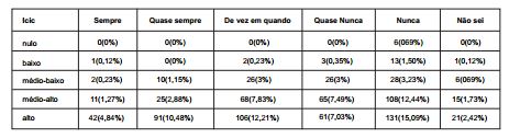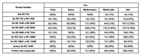 Na Tabela 4, observa-se o cruzamento do Icic com a renda familiar. Como também se poderia esperar, há uma maior distribuição dos entrevistados pelas faixas de renda superiores, visto que a variável inclui o salário dos demais membros da família. Neste caso, a faixa de renda familiar que concentra mais respondentes para todas as categorias de Icic, com a exceção de “nulo” (que teve poucos indivíduos), é a de R$ 2897 a R$ 5068.
