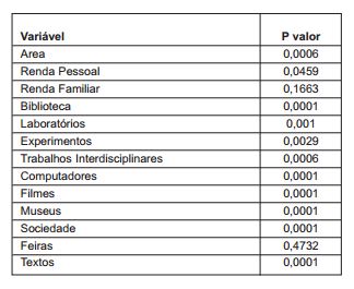 Abaixo estão os resultados do teste de Kruskal Wallis, para verificar se existe diferença significativa de 5% entre os resultados de cada variável e o Icic. Observase que todas as variáveis possuem diferença significativa, exceto “renda familiar” e a prática pedagógica “feira de ciência”.