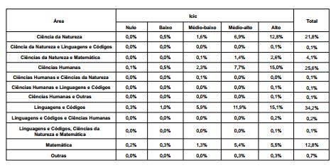 A tabela a seguir traz a distribuição de todos os professores da amostra, por área de atuação e categoria de Icic em que se enquadram. Vale observar que alguns docentes atuam em mais de uma área, mas que a maior parte deles compõe os grupos de Linguagens e Códigos (34,2%), Ciências Humanas (25,6%), Ciências da Natureza (21,8%) e Matemática (12,8%).