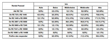 A tabela abaixo (Tabela 3) mostra a distribuição dos entrevistados de acordo com as categorias de Icic e a renda pessoal. Observa-se que das combinações possíveis, a maior concentração de respondentes está nos grupos de Icic alto (cerca de 35% do entrevistados) e médio-alto (25%), com faixa de renda pessoal de R$ 1449 a R$ 5068, para os dois grupos. A distribuição encontrada para a amostra em relação à renda pessoal era esperada, uma vez que o salário base da rede pública estadual de São Paulo para professores da educação básica II, que inclui o ensino médio, vai de R$ 1449,53, para jornada de 24 horas semanais, a R$ 2415,89, para jornada de 40 horas semanais.