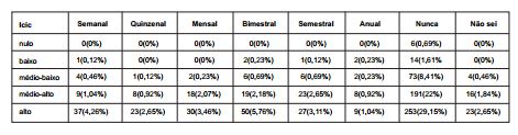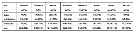Foi analisada também, a frequência de realização de trabalhos interdisciplinares como prática pedagógica, em função do Icic dos professores. A Tabela 8 mostra a distribuição dos entrevistados, cruzando as categorias dos dois indicadores. Nota-se que as interseções que concentram as maiores porcentagens de professores são Icic alto + frequências bimestral (14,75%) e mensal (13,82%); e Icic médio-alto + frequências bimestral (12,21%) e semestral (6,11%).