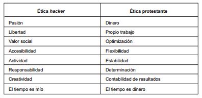 Así, mientras que para la ética protestante del trabajo tanto éste como el dinero son valores supremos y por sí mismos, para el hacker sus principales valores son la pasión que lo mueve y su necesidad y capacidad de creación. Para Himanen son los valores desarrollados por estas éticas los que determinan las dos formas primordiales en las que se ha concebido el trabajo. A partir de siete valores, Himanen compara ambas concepciones: “los siete valores dominantes de la sociedad red y de la ética protestante son el dinero, el trabajo, la optimización, la flexibilidad, la estabilidad, la determinación y la contabilidad de resultados” (Himanen, 2002: 153). En contraposición Himanen rescata para la ética hacker del trabajo los siguientes valores: la pasión, la libertad, el valor social, la accesibilidad, la actividad, la preocupación responsable y la creatividad.