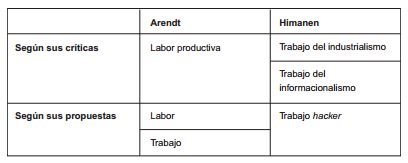 A lo largo de la investigación hemos podido diferenciar seis nociones en torno al trabajo que podrían dividirse en dos grupos: las que corresponden a formas de trabajo criticadas por los autores estudiados y las que se refieren a sus propuestas. En el primer caso, tenemos la noción de labor productiva propia de Arendt y el trabajo del industrialismo y del informacionalismo presentado por Himanen. En ambas críticas se trata de una indagación de las formas propias que adquiere la actividad laboral en un contexto industrial y luego informacional. En el segundo caso, tenemos las nociones de labor y trabajo presentadas por Arendt y de trabajo hacker de Himanen (Tabla 3).