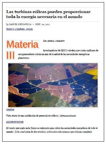 Entre las actividades que se sugiere a los alumnos, además de conocer qué son y cómo funcionan los aerogeneradores de los que se habla en el reportaje, se les propone analizar las diferencias entre los dos estudios prospectivos comparados en el reportaje. Partiendo de ellos, se sugiere que los alumnos estimen la disposición de energía eléctrica aproximada que correspondería a cada ser humano en el planeta si la distribución fuera igual entre todos. También que la comparen con el consumo real de energía eléctrica que tiene su familia actualmente. Y que, para esa comparación, tengan en cuenta qué parte de la demanda de energía eléctrica actual corresponde al ámbito doméstico y qué parte se destina a otros usos. Aportar argumentos a favor o en contra de la instalación masiva de aerogeneradores en el planeta es otra de las propuestas que se plantean a los alumnos para propiciar un debate en el aula sobre este tema. Como también una reflexión sobre la utilidad de los estudios de prospectiva sobre escenarios futuros como los que se incluyen en ese reportaje y una enumeración de los ámbitos en los que, a juicio de los alumnos, sería interesante desarrollar ese tipo de estudios.