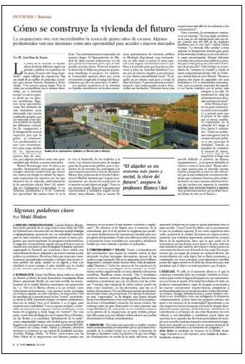 Los efectos negativos de las crisis económicas son evidentes, pero también son momentos estimulantes para la creatividad. En el urbanismo y la arquitectura esto es bastante visible. Tras años de excesos muy agresivos para el territorio y poco propicios para la reflexión, la crisis de la construcción en algunos países es una oportunidad para que urbanistas y arquitectos revisen sus ideas y propuestas sobre el ser y el deber ser de la vivienda y la ciudad. De eso trata el reportaje de Díaz de Tuesta (2009) en el que se aportan perspectivas sobre el futuro de la vivienda. Sobre sus formas constructivas y sobre la participación de los usuarios en la definición de su diseño.