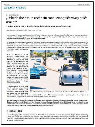 Los automóviles autónomos del futuro plantearán problemas filosóficos. Serán robots sociales que se enfrentarán a dilemas éticos como el de decidir qué vidas proteger en casos límite de accidentes inevitables. Es uno más de esos problemas no técnicos que inspiraron las famosas leyes con las que Asimov exploraba los límites de la robótica. Un tipo de problemas que entrañan dilemas éticos como los que plantea Keith Naughton (2015) en el interrogante que da título al reportaje periodístico que sirve de punto de partida a esta propuesta didáctica.