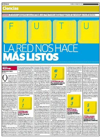 Los seres humanos mejoramos con Internet. Esa es la conclusión de una encuesta realizada por el Pew Research Center de Estados Unidos a 900 expertos (entre profesores universitarios, responsables de empresas tecnológicas o líderes de la Red) que recoge el reportaje de Criado (2010), del que parte este material didáctico incluido en el sexto de los contenedores citados más arriba.[6] Los afectos neurológicos y psicológicos del uso de las redes digitales, las competencias en lectoescritura, el propio futuro de las tecnologías relacionadas con Internet o las posibilidades de mantener la privacidad en el futuro son algunos de los aspectos sobre los que se pronunciaron esos expertos. Y el balance general de sus miradas prospectivas no parece ser muy negativo.