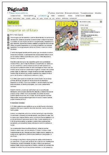 ¿Cómo era el futuro en el pasado? Algunas novelas lo muestran. Por ejemplo, las de H. G. Wells y Robert A. Heinlein que, antes de que las máquinas literarias permitieran viajar en el tiempo, ya habían hecho dormir largos sueños a sus personajes para despertarlos (o descongelarlos) en un futuro remoto. Recuperar esas imágenes del futuro que vienen del pasado permite comprobar que algunas profecías literarias se han hecho sorprendentemente reales. Eso es lo que hace Capanna (2013) en el artículo periodístico que sirve de base a este material didáctico, correspondiente también al séptimo contenedor del proyecto.[8]