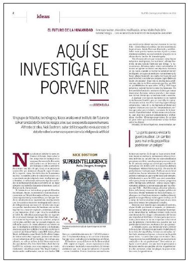 Nick Bostrom dirige en Oxford el Instituto para el Futuro de la Humanidad, un lugar en el que un grupo de expertos en diversas disciplinas piensan sobre algunos de los retos que afrontará nuestra especie en el futuro. Por ejemplo, el de la superinteligencia, la que podría caracterizar a la segunda especie inteligente en nuestro planeta cuando el desarrollo del aprendizaje automático haga que la inteligencia artificial supere a la natural y no dependa de nosotros. Sobre ese escenario prospectivo tan inquietante escribe Elola (2016) un reportaje que sirve de base al correspondiente material didáctico que se incluye en el sexto contenedor del proyecto[9]