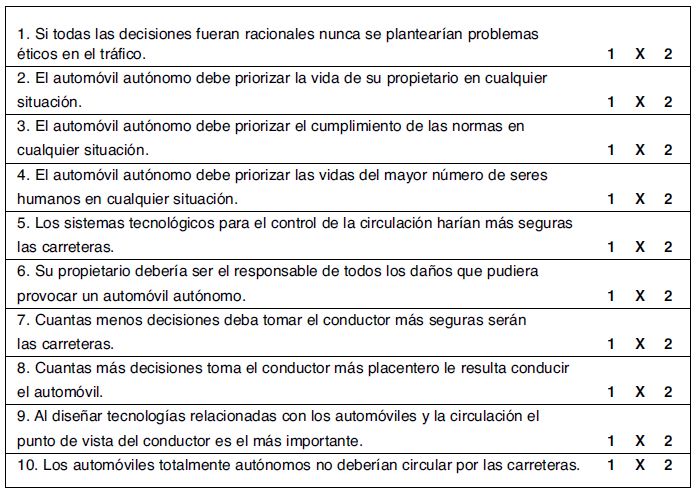 ¿Qué es un robot social? ¿Sería la de un banco de peces una metáfora adecuada para entender el tráfico en el futuro? ¿Qué son los dilemas? ¿Y los dilemas éticos? ¿Quién debe resolverlos? ¿Debería un automóvil en una situación límite salvar la vida de su dueño si para ello tuviera que provocar la muerte de un mayor número de personas? ¿Desearíamos encontrarnos en la carretera con ese tipo de automóviles egoístas? ¿Se venderían los automóviles altruistas que estuvieran programados para proteger un mayor número de vidas? Cuestiones como éstas son las que se plantean en las actividades que se proponen para el trabajo en el aula con este material didáctico.[5] Un tipo de problemas que plantean la dimensión ética que tiene el diseño de escenarios futuros en relación con algo tan próximo como son los automóviles y la ordenación del tráfico. Como en muchos otros materiales didácticos, en éste también se ofrece a los alumnos una serie de frases con la forma de quiniela valorativa que propicia interesantes controversias en el aula.