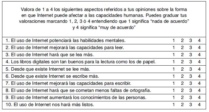 Internet y las capacidades humanas, el futuro de Internet y qué falta en Internet son los tres apartados de la encuesta que se propone a los alumnos para conocer la percepción de su entorno sobre estos temas.