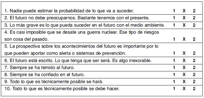 Por último, se propone a los alumnos valorar y discutir la relevancia de este tipo de análisis prospectivos a partir de esa herramienta clásica del proyecto Contenedores que es la quiniela valorativa, que en este caso estaría formada por las frases muy sugerentes para propiciar en el aula un debate general sobre el valor de la prospectiva.