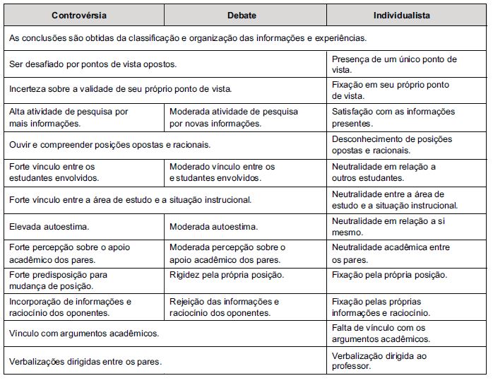 Em relação às controvérsias, Johnson e Johnson (1985: 254) afirmam que as situações de conflito são percebidas de forma negativa, de maneira geral, tanto nas escolas quanto na sociedade. Entretanto, situações envolvendo conflitos estruturados, como as controvérsias sociotécnicas, podem trazer diversos efeitos positivos no ambiente educacional (Johnson e Johnson, 1985: 254). O Quadro 1 apresenta uma comparação entre as características da aprendizagem centrada em controvérsia, em debate ou individualista.