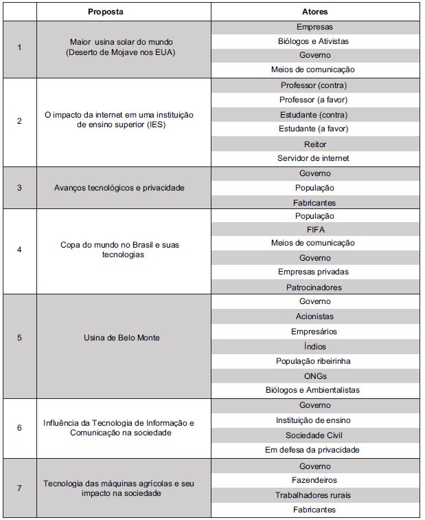 Pesquisa desenvolvida por Veraszto et al. (2011) concluiu que estudantes de graduação do Estado de São Paulo, Brasil, consideram que os atores que melhor representam a sociedade nos processos de tomada de decisão tecnológica são: governo, instituições educacionais e de pesquisa e cidadãos de maneira geral. Assim, os estudantes se sentem aptos a participarem ativamente do processo de tomada de decisão, bem como esperam uma posição do governo. Entretanto, não acreditam que as empresas privadas procurem tomar decisões adotando como referência o bemestar social, mas são pautadas pelo lucro e a hegemonia no mundo dos negócios (Veraszto et al., 2011).