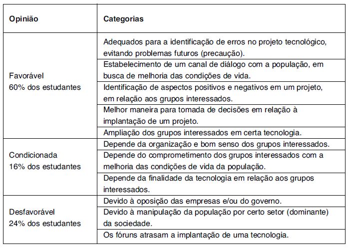 Para Silva e Carvalho (2007:7), a utilização de temas controversos permite romper com algumas concepções arraigadas no ambiente educacional, principalmente na área de engenharia, como a de verdade absoluta, neutralidade da ciência e da tecnologia e o determinismo em relação ao desenvolvimento tecnológico.