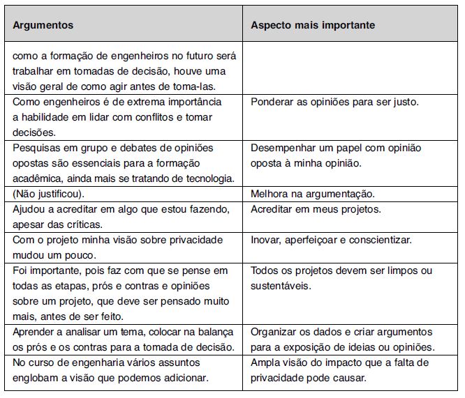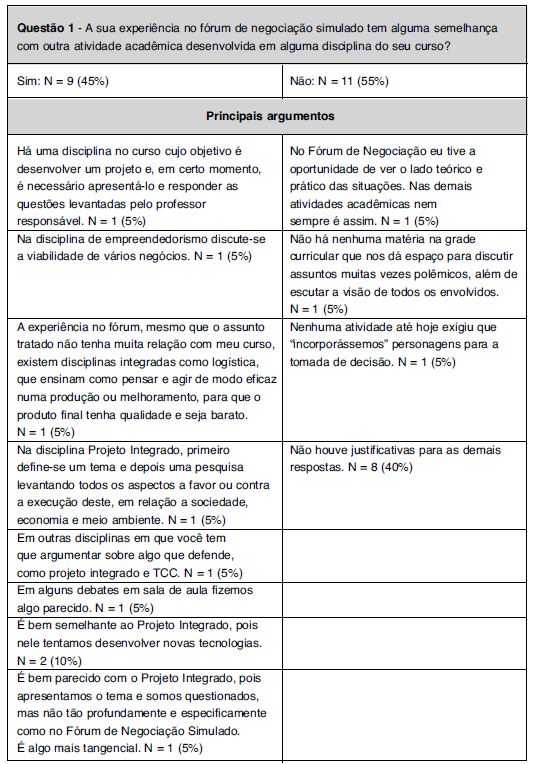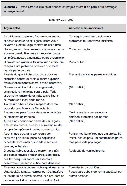 O Quadro 5 apresenta os resultados obtidos das respostas à questão 2 do questionário 2. Todos os estudantes afirmaram que as atividades desenvolvidas no Fórum de Negociação Simulado foram úteis para a sua formação na área de engenharia. A partir da análise dos argumentos dos estudantes pode-se notar que dois aspectos se destacam: o desenvolvimento da criticidade, considerando os aspectos positivos e negativos de um projeto, visando a tomada de decisão embasada em pesquisa e a criação de um ambiente propício ao debate democrático de ideias, com o confronto dos diversos pontos de vista, representados pelos atores. Tais características são desejáveis ao profissional da engenharia no mundo atual, além de aproximar o ambiente acadêmico da realidade do trabalho na área.