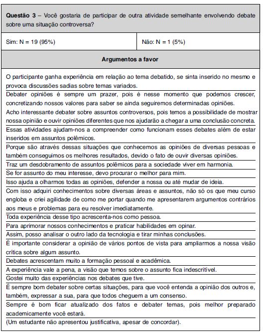 O Quadro 6, a seguir, apresenta os resultados obtidos das respostas à questão 3 do questionário 2. A maioria dos estudantes (95%) se mostrou favorável a esse tipo de estratégia didática. Apenas um estudante, o que corresponde a 5%, se mostrou contrário à participação em atividades semelhantes, pois assumiu uma postura inflexível acerca de suas opiniões já definidas. Ele argumentou da seguinte maneira: “Eu já tenho uma ideia formada em relação a tecnologia”. Essa afirmação indica a falta de disposição ao debate sobre a concepção de tecnologia e como ela é construída socialmente.