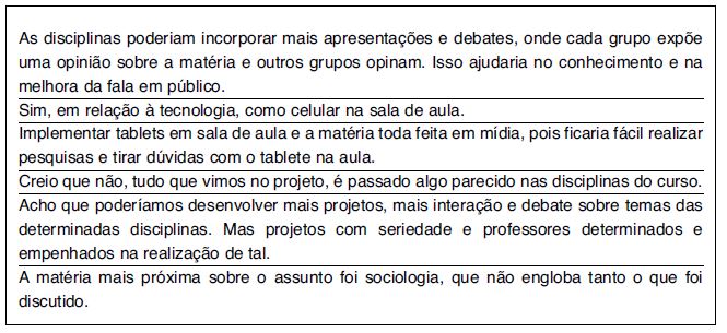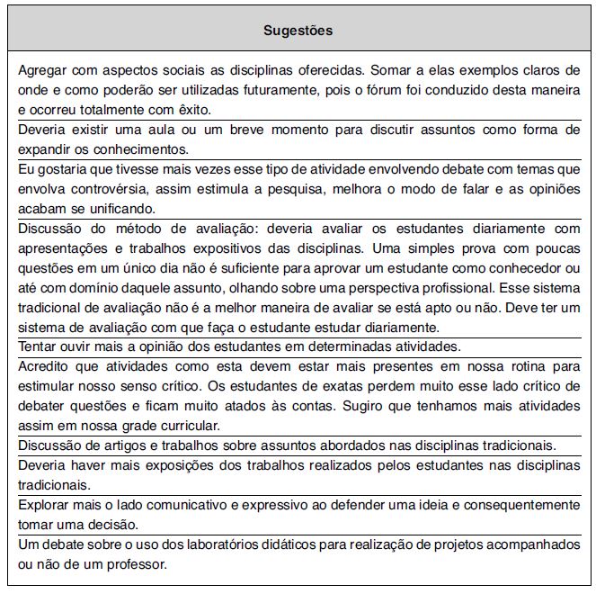 A maioria dos estudantes (80%) apresentou sugestões às disciplinas tradicionais dos cursos de engenharia, baseado em sua participação nos debates dos fóruns de negociações simulados. Apenas quatro estudantes (20%) não apresentaram sugestões. De acordo com as sugestões dos estudantes, nota-se o reconhecimento em agregar as disciplinas específicas com os aspectos sociais, além de envolver debate sobre assuntos sociotécnicos controversos. Essa estratégia didática, que culminou nos Fóruns de Negociações Simulados, foi considerada positiva pelos estudantes, como forma de desenvolver a elaboração de melhores argumentos e a expressão oral dos mesmos em um debate. Também foi considerada positiva a experiência em ouvir opiniões divergentes das suas, estimulando o senso crítico e o debate democrático de ideias.