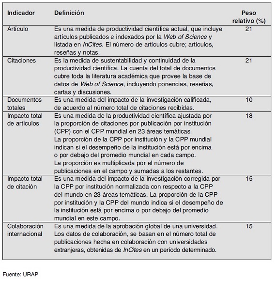 Aunque los indicadores de investigación, cuando son medidos por el tipo de publicaciones registradas en dichas fuentes, reciben numerosas críticas, aun cuando se trata de la evaluación en ciencia, su simplicidad es útil para construir una visión global de las universidades. Por el contrario, los indicadores de docencia, o no existen, o son rudimentarios y los de vinculación con el entorno o de “tercera misión”, por su dificultad son objeto de análisis en varios proyectos internacionales, entre los que destaca el Manual de Valencia impulsado por la RICYT y la OEI, sin que haya sido posible determinar, hasta el presente, una fórmula que permita incorporar en una comparación internacional aquellos aspectos esencialmente relacionados con los contextos locales.