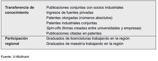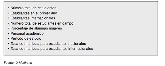 Las dimensiones incluidas son enseñanza y aprendizaje, investigación, transferencia de conocimiento, orientación internacional y compromiso regional. U- Multirank utiliza datos empíricos para comparar instituciones con perfiles institucionales similares y permite a los usuarios el desarrollo de rankings personalizados por medidas de desempeño e indicadores, en términos de sus propias preferencias.