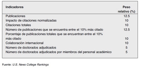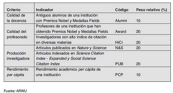 El sesgo hacia la investigación de este ranking es casi absoluto y resulta evidente que el modelo de calidad implícito está decididamente orientado a la investigación de punta, ya que las universidades son seleccionadas de acuerdo a la cantidad de Premios Nobel o Medallas Fields alcanzados por sus profesores o alumnos; a sus investigadores altamente citados; a los artículos publicados en Nature o Science durante los últimos diez años; y a los artículos indexados por Science Citation Index - Expanded (SCIE) y Social Science Citation Index (SSCI). 3 A cada indicador se le asigna un valor máximo de 100, que se corresponde con el obtenido por la mejor universidad en las diferentes categorías. Para las otras universidades, el indicador se calcula como un porcentaje proporcional de ese valor máximo. En el caso de las instituciones especializadas en humanidades y ciencias sociales no se considera el criterio de publicaciones en Nature y Science y el valor se redistribuye entre los demás indicadores de forma proporcional.