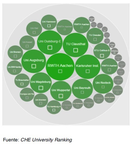 Para generar resultados gráficos con respecto al desempeño de las universidades en Alemania, el ranking permite seleccionar áreas de conocimiento y criterios (indicadores) de acuerdo a la preferencia de los usuarios. Las mejores universidades aparecen en el centro del gráfico. En este caso, se ha elegido el área de ingeniería industrial y se han tomado como indicadores la situación general de los estudiantes, orientación a la investigación, infraestructura informática, graduaciones en tiempo apropiado y orientación internacional.